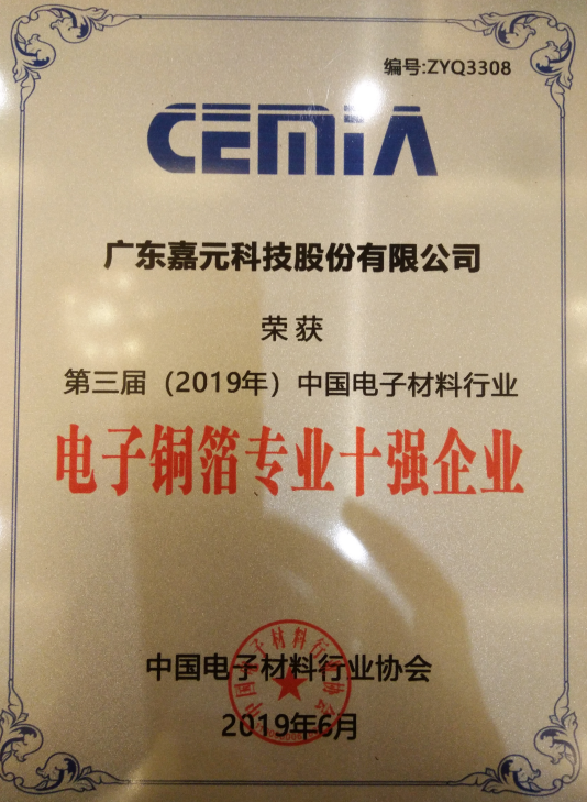 近日,廣東嘉元科技股份有限公司(以下簡稱“公司”)收到中國電子材料行業(yè)協(xié)會(huì)頒發(fā)的“第三屆(2019年)中國電子材料行業(yè)五十強(qiáng)企業(yè)”和“第三屆(2019年)中國電子材料行業(yè)電子銅箔專業(yè)十強(qiáng)企業(yè)”榮譽(yù)稱號(hào)。