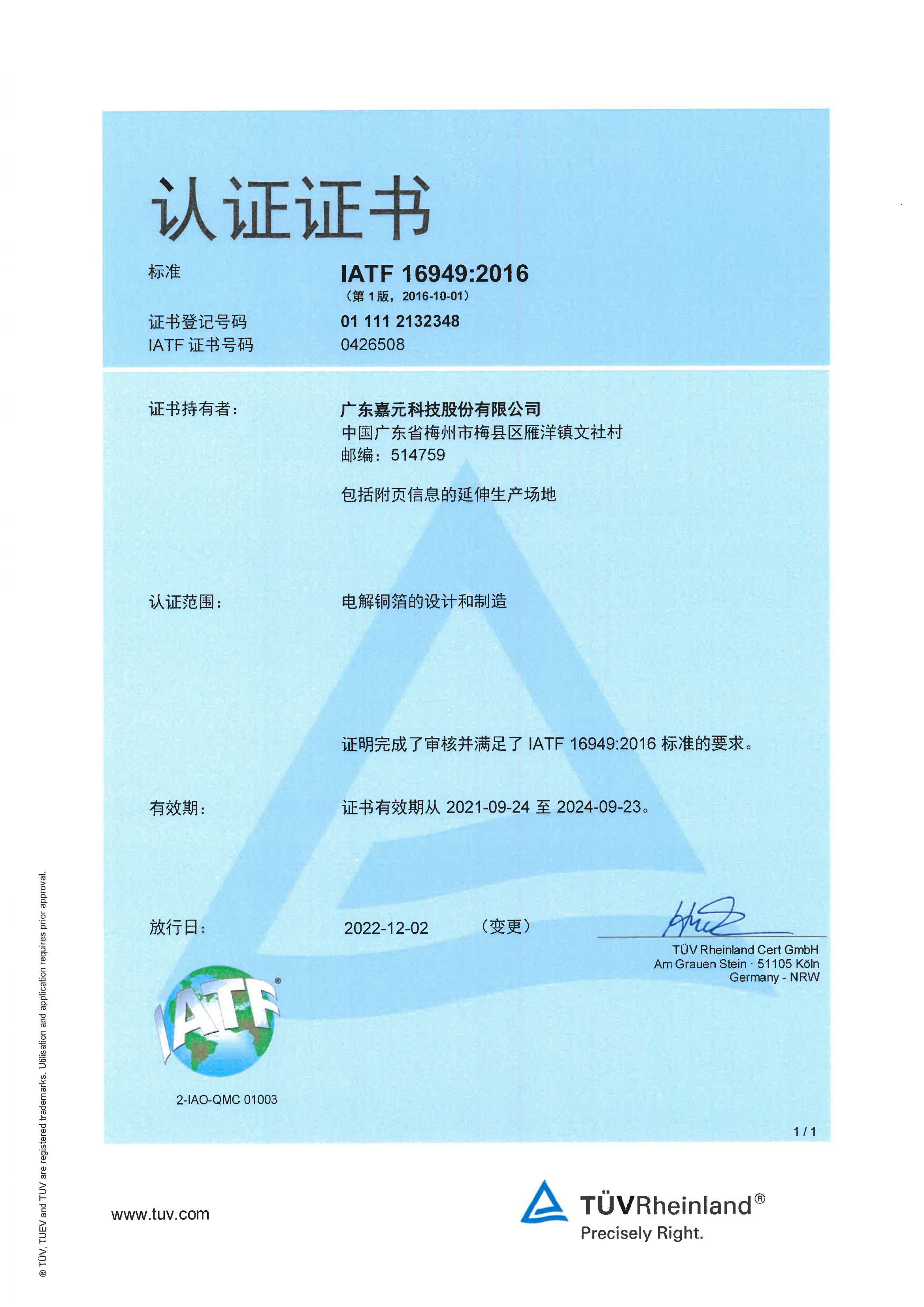 IATF 16949:2016認(rèn)證證書